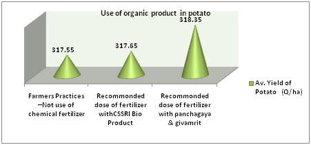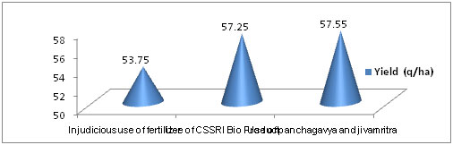 - Farmers realized the facts of demonstrated technology. Yield of technology i.e. use of panchagavya and jivamritra along with recommended dose of fertilizers were 57.55q/ha fallowed by use of CSSRI Bio Product along with recommended dose of fertilizers (57.25 q/ha) and non-judicious use of fertilizers (53.75q/ha).